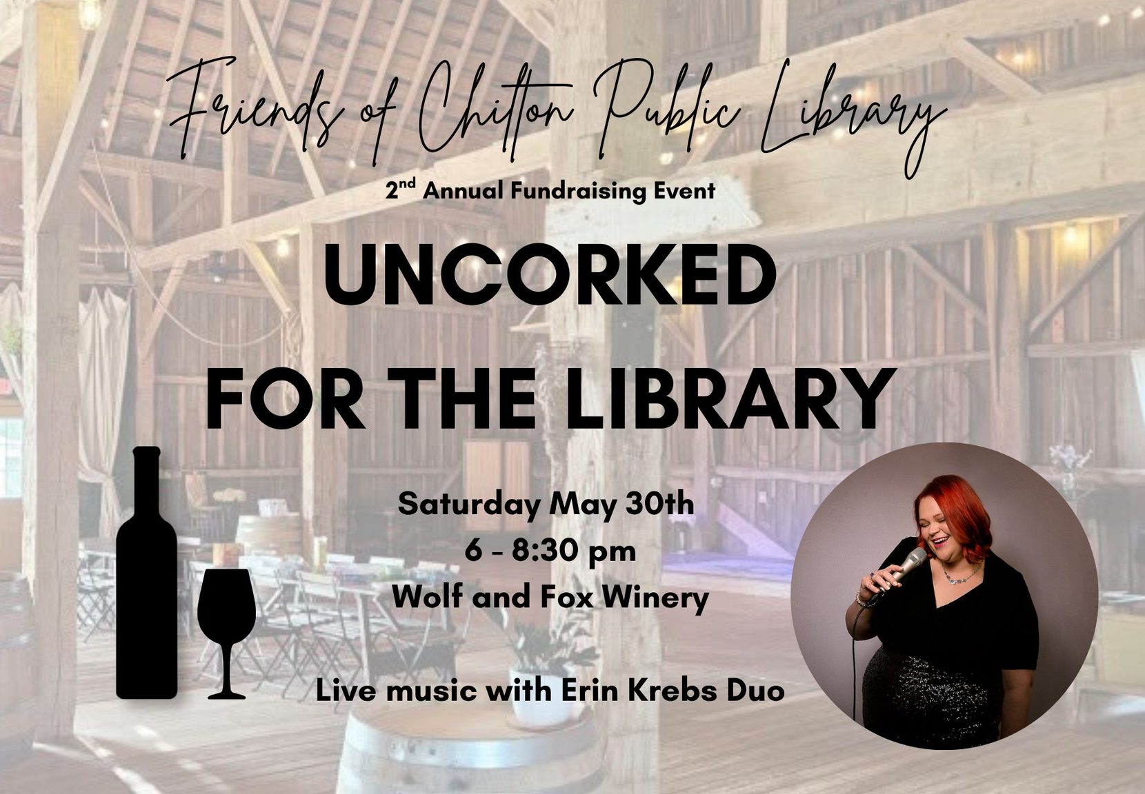 Join us at Wolf and Fox Winery in New Holstein for an evening of fun and flavor at Uncorked for the Library! Sip on a variety of delicious wines and support the Chilton Public Library. Enjoy live music from Erin Krebs Duo and visit Fiamma Del Forno’s food truck on site serving up tasty woodfire pizzas! It’s the perfect way to unwind, mingle, and raise a glass to community spirit. Don’t miss out on this laid-back, fun-filled night – see you there!